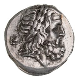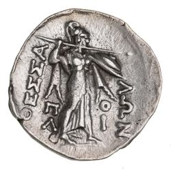THESSALY, Thessalian League, (196-146 B.C.), silver stater or double victoriatus, (6.26 g), Poli- magistrate, obv. head of Zeus to right, crowned with oak leaves, monogram behind, rev. Athena Itonia advancing to right, brandishing spear and holding shield, on sides **QESSA LWN*, across field **P*O LI, (cf.S.2232, BCD Thessaly I 1370 (same obv. die), BCD Thessaly II 813, HGC 4, 208). Very light marks on reverse, otherwise nearly extremely fine.