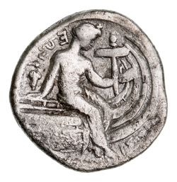 EUBOIA, Histiaia, (mid 4th century B.C.), silver tetrobol, (2.49 g), obv. nymph Histiaia head to right wreathed with vine leaves, hair rolled, rev. nymph Histiaia seated to right on galley with stylis, legend **ISTIAI to lower right, E**W*N (N reversed) behind over grapes, aplustre on galley, (S.2495, cf.BCD 367 [Lanz 111, similar dies], BMC 24 [Pl.XXIV, 6], Gulbenkian II, 510, Newell (pl.1, 4). Very fine, a very rare variant.