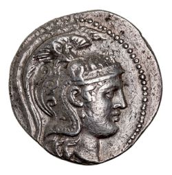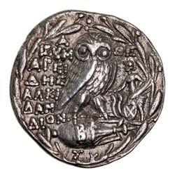 ATTICA, Athens, (168-57 B.C.), silver tetradrachm, (16.66 g), issued 145-4 B.C., (Thompson date) but probably 113-2 B.C. (revised chronology), obv. head of Athena Parthenos to right, wearing triple crested Athenian helmet, ornamented with Pegasos and forepart of horses, dotted border, rev. Owl standing right, head facing on prostrate amphora, to right Triptolemos in chariot to left, **A QE* across, to left **EUM/ AREI/ DHS/ ALKI/ DAM/ DION*, in exergue traces of **SO* or **SF*, on amphora B, all within olive wreath, (cf.S.2555, Thompson 673c [same dies] = example in Sophia Museum). Nearly extremely fine and very rare, with collector tickets.