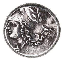 CORINTHIA, Corinth, (c.375-300 BC), silver stater (8.55g), obv. Pegasos flying left, Q below, rev. head of Athena left, wearing a laureate Corinthian helmet, boar standing on ground line left to right of neckguard, [A]-P below (Ravel 781; HGC 4 1837; Calciati 435). Toned, very fine.