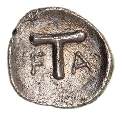PELOPONNESOS, Elis, Olympia, 95th Olympiad, (400 B.C.), silver tetartemorion, (7mm, 0.18 g), obv. head of eagle right, rev. large T (mark of value), F A flanking, (S.2893, Seltman, Temple, pl. VIII, 18 var (no ethnic), BCD Olympia 87 var (same), HGC 5, 504). Lightly toned, minor porosity, well centered, good very fine and very rare.