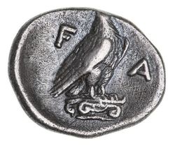 PELOPONNESOS, Elis, Olympia, 108th Olympiad, (352-348 B.C.), silver hemidrachm (2.57 g), Olympia Zeus Mint, obv. laueate head of Zeus to right, rev. F A across. with eagle standing right, with short legs and smooth tail feathers on and Ionic capital capital, (S.2895, BCD Olympia 139 [p.58 Leu 90, May 10, 2004 same dies], BMC 83 [same dies], SNG Cop.388, HGC 5, 440). Very fine, toned, reverse slightly off centred, very rare.