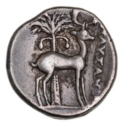 IONIA, Ephesos, (202-c.150 B.C.), silver drachm, (4.16 g), obv. bee with straight wings dividing E - **F*, dotted border, rev. stag standing to right, palm tree behind, to right magistrate's name **[P]AUSANIA[S]* (Pausanias) (cf.S.4387, Kinns Num. Chron. 1999 [p.89], SNG von Aulock 1850). Toned, very fine and rare.