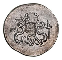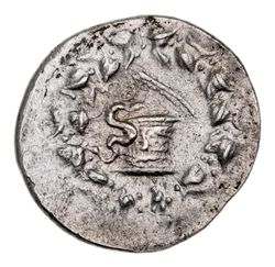 IONIA, Ephesos, (c.133-132 B.C.), silver cistophoric tetradrachm, (12.64 g), year **G* = 3 = 132-131 B.C., obv. Cista mystica with half opened lid, from which a serpent issues left, the whole in wreath of ivy, rev. two coiled serpents with erect heads between them a bow case with a strap ornamented with an aplustre and strung bow at left, long upright torch to right, bee between serpents to left **G* (= year 3), E **F* E below to left, (cf.S.4394, Kleiner ANS Museum Notes 18, No. 3 (p.24), Pinder 27, SNG Von Aulock 7846). Nearly extremely fine and rare.