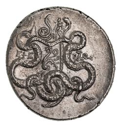 IONIA, Ephesus, (c.180-67 B.C.), silver cistophoric tetradrachm, (12.62 g), struck 137-134 B.C., obv. cista mystica containing serpent, all within ivy wreath, rev. bow in case between two coiled serpents, to left **EFE, to right hippocamp, naked male (Herakles?) above, (cf.S.4395, Kleiner & Noe Series 39.56, SNG Copenhagen -). Bright, nearly extremely fine and rare.