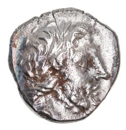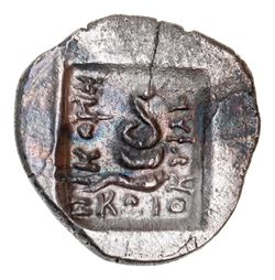CARIA, Carian Islands, Cos (Kos), silver reduced drachm (Sear), silver tetrobol (Kroll MN 11), (167-88 B.C.), (2.35 g), obv. laureate head of Asklepios to right, rev. coiled serpent in incuse square below, KOI, to left NIKOMH and to right OKY**FL*H for **Q*EY**F*AN, trace of letter **D* below, (S.5004 var., BMC - [but spec. in colln. of same magistrates], Paris Inventory 1215, cf.Von Aulock 2762 [Pl.88], See Kroll 18 [MN XI, 1964, p.110]. Attractive tone, nearly extremely fine and very rare with the unpublished spelling.
