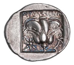ISLAND OF CARIA, Rhodes, (167-88 B.C.), silver drachm, (2.60 g), obv. radiate head of Helios to right, rev. rose, with bud on right, star to left, in field P O, above **QRASUMENHS*, all within incuse square, (cf.S.5063, Jenkins Group C, No.72, BMC -). Lightly toned, extremely fine.