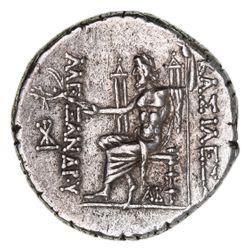 SYRIA, Kingdom of, Alexander II, (128-123 B.C.), silver tetradrachm, (16.22 g), Uncertain mint in Northern Syria, issued 128-123 B.C., undated, obv. diademed head of Alexander II to right, fillet border, rev. Zeus seated to left on throne holding Nike and sceptre, on right **BASILEOS to left **ALEXANDROU* to left monograms of XI**D*, under throne AB, (cf.S.7115, SC 2246, Newell SMA -, SNG Israel I (Spaer) -, cf.ACNAC Houghton -, HGC 9, 1149f [R2]). Extremely fine and very rare.