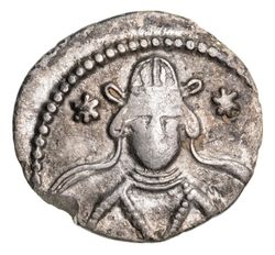 PARTHIA, Kingdom of, Vonones II, (c.A.D. 51), silver drachm, Ecbatana Mint, (3.26 g), obv. short bearded bust facing, wearing tiara, with lateral motif a horn, stars either side very low over shoulder, rev. archer enthroned to right, mint mark below, (S.5797, Sell.67.1). Toned, very fine, scarce.