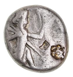 PERSIAN IMPERIAL COINAGE, Kingdom of, Artaxerxes I - Artaxerxes II (c.450-375 BC), silver siglos (5.44g), obv, Persian king running/kneeling right, holding bow and spear, quiver over shoulder, two countermarks to right, rev. oblong incuse, countermark to left (Carradive Type IIIB [late]; Countermarks obv. 35, 197, rev. 18-19). Fine.