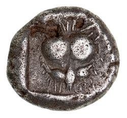 KYRENAIKA, Kyrene, silver drachm, (c.500-480 B.C.), (3.48 g, Asiatic standard), obv. two Silphium fruit set base to base, pellet between, leaves at sides between, rev. facing head of lion within incuse square, (S.6244, BMC 38, SNG Cop 1172, Buttrey Coins Period I, Group 2, 87). Slightly granular surfaces, toned, very fine and very rare.