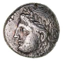KYRENAICA, Kyrene, Magas as Ptolemaic Governor, first reign, (c.300-282/75 B.C.), silver didrachm, (6.73 g), obv.^laureate head of Apollo left, rev. Silphium plant, K Y - **P* A to sides, **SW* to lower right, (S.-, SNG Cop.-, BMC 261 [same dies]). Lightly toned, some surface porosity very fine and very scarce.