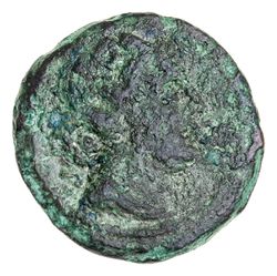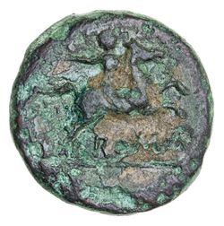 REPUBLIC, Anonymous issues, (c.217-215 B.C.), uncertain mint, semiliberal, AE uncia, (5.42 g), obv. turreted and draped female bust right, pellet behind, rev. horseman galloping right holding whip, ROMA below, (S.619, Cr.39/5, Syd. 97). Green patina with oxidation, needing conservation, otherwise fine and rare.