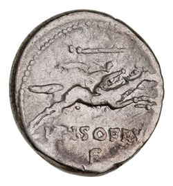 L. CALPURNIUS PISO L.F L.n Frugi, (90 BC), silver denarius (3.82g), Rome mint, obv. laureate ...