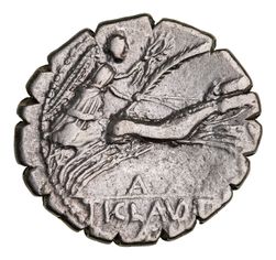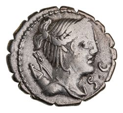 TI. CLAUDIUS TI.F. Ap.n. Nero, (79 BC), silver denarius serratus (3.69g), Rome mint, obv. draped and diademed bust of Diana facing right, bow and quiver over sholder, S.C before, rev. Victory in biga galloping right, holding palm and wreath, A below, TI CLAVD T[I F] in exergue (Crawford 383/1; Sydenham 770; S.310). Obverse slightly offcentre, otherwise nearly very fine.