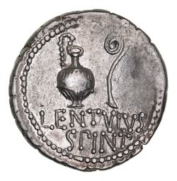C. CASSIUS LONGINUS, (died 42 B.C.), denarius, issued Spring 42 B.C., mint travelling with Cassius and Brutus in the East (probably Smyrna), P.Lentulus Spinther legate, (3.78 g) obv. veiled and diademed head of Libertas to right, around, C CASSI IMP LEIBERTAS, dotted border, rev. jug and lituus, below LENTVLVS SPINT, dotted border, (S.1447, Cr.500/5, Syd.1305, RSC 6). Lightly toned, small test cut on edge, good very fine and rare.