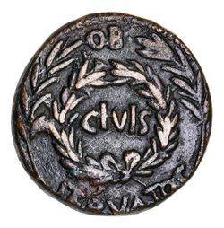 AUGUSTUS, (27 B.C. - A.D. 14), AE sestertius, Rome Mint, issued 16 B.C. by C. Gallius Lupercus, (27.15 g), obv. OB / CIVIS / SERVATOS in three lines, with oak wreath between laurel branches, rev. C. GALLIVS C F LVPERCVS III VIR A A A F F around large SC, (S.1646, RIC 377, C.434, CBN 415, BMC 171). Very fine and very scarce.