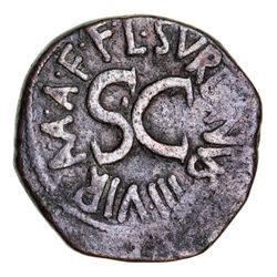 AUGUSTUS, (27 BC - 14 AD), copper as (11.43g), Rome mint, moneyer's series, issued 15 BC, obv. bare haed right, CAESAR AVGVSTVS TRIBVNIC POTEST, rev. L. SVRDINVS VIR A.A.A.F.F. around large SC (S.1683; RIC 386; BMCRE 144). Fine.