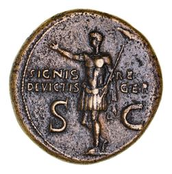 GERMANICUS, son of Nero Claudius Drusus, (born 15 B.C., died A.D. 19), AE dupondius, Rome Mint, issued under Caligula, A.D. 37-41, (12.92 g), obv. GERMANICVS CAESAR, Germanicus in triumphal quadriga to right, with sceptre, rev. SIGNIS RECEPT DEVICTIS GERM, large SC below, Germanicus standing left, right hand raised, holding legionary eagle in left hand, (S.1820, RIC 57, C.7, CBN 140, BMC 93). Toned, minor surface pitting, very fine and rare.