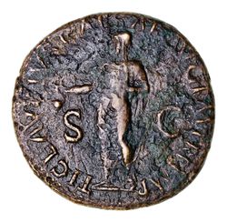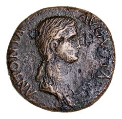 ANTONIA MINOR, daughter of Mark Antony and Octavia, niece of Augustus, wife of Nero Claudius Drusus, mother of Claudius, grandmother of Caligula, (41-2 AD), brass dupondius (12.02g), Rome mint, obv. bare headed and draped bust right, ANTONIA AVGVSTA, rev. Claudius, veiled and togate, standing left, holding simpulum and volumen (S.1902; RIC 92 [Claudius]; BMCRE 166). Some surface roughness and hard green adhesions, nearly very fine.