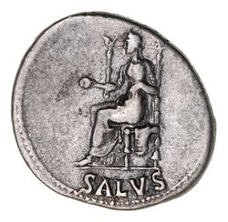 NERO, (A.D. 54-68), silver denarius, issued c.66-67, Rome Mint, (3.44 g), obv. laureate head to right of Nero, around NERO CAESAR AVGVSTVS, rev. Salus seated left on throne, holding patera, SALVS in exergue, (cf.S.1945, RIC 52, BMC 90, RSC 314). A nice example, dull grey patina, very fine and rare in this condition.