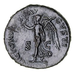 NERO, (A.D. 54-68), bronze dupondius (12.87g), Lugdunum mint, issued 66 AD, obv. laureate head left, globe at point of neck, IMP NERO CAESAR AVG P MAX TR P P P, rev. Victory advancing left, holding wreath in right hand and palm from over left, VICTORIA AVGUSTI (S.1970; RIC 523; BMCRE 356). Nearly extremely fine.