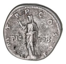 HADRIAN, (A.D. 117-138), silver denarius, issued 118, Rome Mint, (3.37 g), obv. laureate head to right of Hadrian, draped on far shoulder, around IMP CAESAR TRAIAN HADRIANVS AVG, rev. P M TR P COS II, Pietas, veiled, standing left, raising right hand, PIE TAS to left and right, (cf.S.3512, RIC 45a, RSC 1027). Lightly patinated, nearly very fine. scarce.