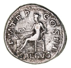 HADRIAN, (A.D. 117-138), silver denarius, Rome Mint, issued A.D. 117, (3.22 g), obv. laureate head of Hadrian to right, around IMP CAESAR TRAIAN HADRIANVS AVG, rev. PM TR P COS III around, SALVS AVG in exergue, Salus seated to left on throne feeding serpent arising from altar, (cf.S.3539, RIC 137a, RSC 1324). Toning, nearly very fine.