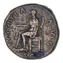 HADRIAN (A.D. 117-138), AE sestertius, issued 136, (25.98 g), obv. bare head to right of Hadrian draped, around HADRIANVS AVG COS III PP, rev. IVSTITIA AVG around, S C in exergue, Justitia seated to left holding patersa and vertical sceptre, (cf.S.3605, RIC II.3 2271, Cohen 880). Light brown patina, nearly very fine and scarce.