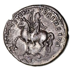 SEPTIMIUS SEVERUS, (A.D. 193-211), silver denarius (3.05g), Emesa mint, issued 194 AD, obv. laureate head facing right, IMP CAE L SEP [SEV PER]T AVG COS III, rev. Severus in military dress, pracing on horseback left, holding a spear, SPQR OPTIMO PRINCIPI around. Dark toned, small flan chip at 7 o'clock, very fine.