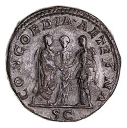 JULIA PAULA, (first wife of Elagabalus), (A.D. 219-220), AE sestertius (22.24 g), Rome Mint, struck under Elagabalus, AD 219-220, obv. draped bust to right, around IVLIA PAVLA AVG, rev. Elagabalus and Julia Paula standing, clasping hands, between them, Concordia standing facing, around CONCORDIA AETERNA, SC in exergue, (S.7661, RIC IV 386 Elagabalus), C.14, Thirion 448, Banti 9. Attractive patina, areas of smoothing, otherwise good very fine - nearly extremely fine and extremely rare.