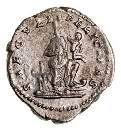 JULIA DOMNA, wife of Septimius Severus, (A.D. 193-217), silver denarius (3.14g), Rome mint, issued 201 AD, pbv. draped bust facing right, IVLIA AVGVSTA around, rev. Ising standing right, wearing Polos, left food on prow, rudder against altar behind and resting toddler Horus on knee, SAECVLI FELICITAS around (S.6606; RIC IV 577; RSC 173).^Small spot of verdigris on neck, very fine.