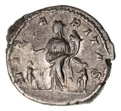 JULIA DOMNA, wife of Septimius Serverus (A.D. 196-211), silver denarius, Rome Mint (3.08 g), obv.drapped bust right, around IVLIA AVGVSTA, rev. Hilaritas standing left holding palm and cornucopia, two small figures at sides, around HILARITAS (RIC.557, RSC.79). Very fine, toned.