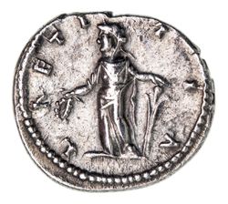 JULIA DOMNA, wife of Septimius Severus, (A.D. 193-217), silver denarius, issued 198-202, Laodicea Mint, (2.97 g), obv. draped bust to right of Julia Domna, around IVLIA AVGVSTA, rev. Laetitia standing left holding wreath and rudder, around LAETITIA, (S.6590, RIC 641, RSC 101) (illustrated); another, Rome Mint, (4.36 g), obv. draped bust to right of Julia Domna, around IVLIA AVGVSTA, rev. Pietas standing to left both hands raised in invocation, altar at feet, around PIETAS PVBLICA, (S.6601, RIC 574 [Severus], RSC 156). Very fine - nearly extremely fine. (2)