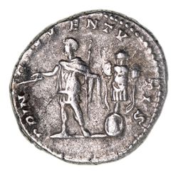 GETA, (A.D.209-212), issued as Caesar, 200 A.D., silver denarius, Rome Mint, (3.24 g), obv. P SEPT GETA CAES PONT, bust draped to right, rev. around PRINC IVVENTVTIS, Geta standing left, trophy behind, (S.7196, RIC 18, RSC 157b). Nearly extremely fine.