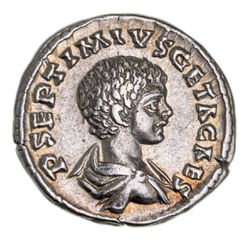 GETA, (A.D. 209-212), silver denarius, issued 199-200, Laodicea Mint, (3.55 g), obv. laureate bust to ...
