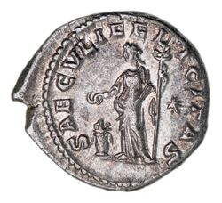 JULIA MAESA, grandmother of Elagabalus, (218-222 A.D.), silver denarius, Rome Mint, (3.45 g), obv, draped bust right, IVLIA MAESA AVG, rev. around SAECVLI FELICITAS, Felicitas standing to left, sacrificing out of patera over altar holding caduceus, star right, (S.7757, RIC 271, RSC 45). Good very fine.