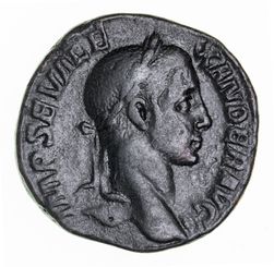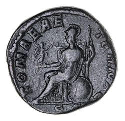 SEVERUS ALEXANDER, (A.D. 222-235), AE sestertius (20.86 g), Rome Mint, issued A.D. 228, obv. laureate bust of Severus Alexander to right, around IMP SEV ALEXANDER AVG, rev. Roma seated left on shield, holding Victory and sceptre, around ROMAE AETERNAE, (S.8016, RIC 602, C 520). Deeply toned, very fine and scarce.