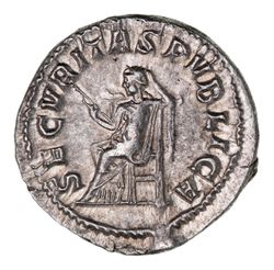 GORDIAN III, (A.D. 238-244), silver denarius, Rome Mint, issued 241-2, (3.10 g), obv. laureate draped bust right, around IMP GORDIANVS PIVS FEL AVG, rev. around SECVRITAS PVBLICA, Securitas seated to left, holding sceptre, (S.8682, RIC 130, RSC 340. Hunter 65). Nearly extremely fine.