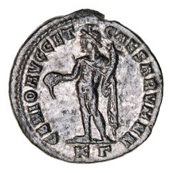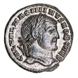 MAXIMINUS II DAZA, (A.D. 310-13), billon follis (7.30g), Cyzicus mint, 3rd officina, issued 306 AD as Caesar, obv. laureate head right, GAL VAL MAXIMINVS NOB CAES around, rev. Genuis wearing modus. Surviving silvering, nearly extremely fine and scarce.