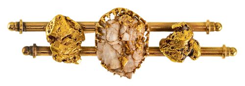 GOLD NUGGET BROOCH, c1905, in gold (15ct; 10.46g; 53x15.5mm), by B(urmeister) Bros, features two bars and attached in the centre is a claw set piece of quartz with gold veins and at the sides are original gold nuggets, pin-back with loop provision for safety chain, in Percy Marks, Gem Merchants case. Very fine.
