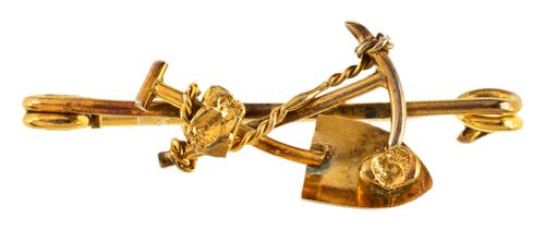 PICK AND SHOVEL BROOCH, in gold (tested as 15ct; 2.92g; no maker, features a thin bar with a pick and shovel and a few nuggets in the centre, pin-back, with unofficial box. Good very fine.