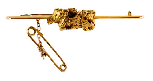 GOLD NUGGET BROOCH, in gold (9ct; 8.74g; 54x9mm), by C.H.S (C.H.Schild), features a thin bar with a gold nugget in the centre, pin-back with safety chain, with unofficial box. Good very fine.