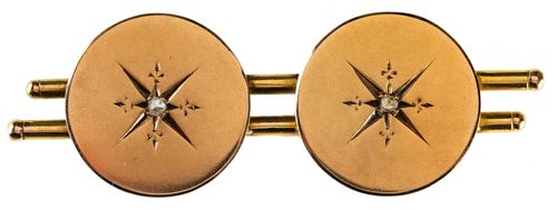 BROOCH, in gold (tested as 15ct; 13.03g; 68x23mm), no maker mark, features a double bar with two circular discs attached at the front, each disc features an engraved star in the centre and in the centre of each star is a small diamond, pin-back. Good very fine.
