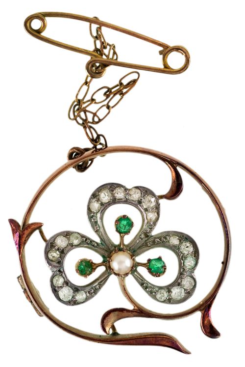 BROOCH, in voided gold (15ct; 4.55g; 25mm); by Levinson (& Sons), features an irregular circle around a three leaf clover decorated with old cut diamonds, natural emeralds and a seed pearl, pin-back but this broken (pin included). Gold heavily toned, very fine. $$ Australian Jewellers Makers & Marks, p157, fig6.