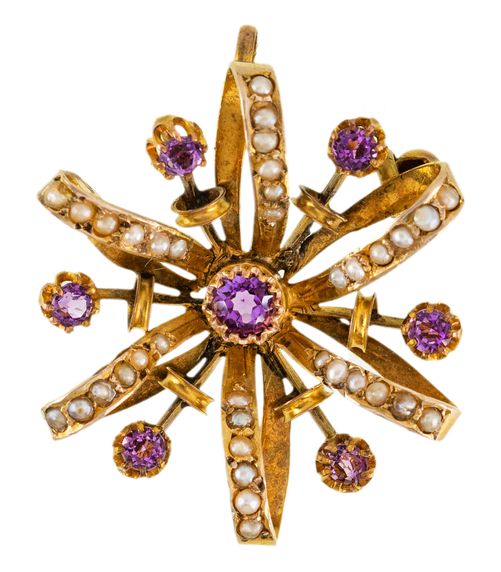 BROOCH, in voided gold (9ct; 4.12g; 28x29mm), by T&S (Taylor & Sharp), features a floral display decorated with natural seed pearls and seven amethysts, pin-back with suspender for wearing as a pendant. Toned extremely fine.