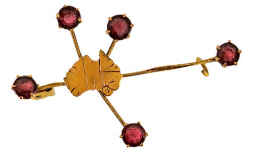BROOCH, in gold (9ct; 2.52g; 46x29mm), maker unknown, features a thin bar with five prongs each with a claw set red gemstone at the end, where the prongs emanate from the bar there is a small map of mainland Australia, pin-back. With a bend in the thin bar and toned, otherwise very fine.