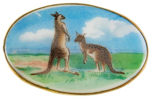 BROOCH, in painted porcelain in a gold plated frame (tot wt 11.68g; 52x33mm), maker unknown, features two facing kangaroos in a field, pin-back. Solder mark on metal frame, otherwise very fine.