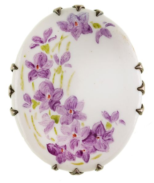 BROOCH, in hand painted porcelain on a sterling silver frame (tot wt 12.70g; 42.5x43.5mm), by ...