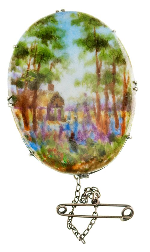 BROOCH, in hand painted porcelain on a sterling silver frame (tot wt 12.70g; 42.5x43.5mm), by H.G. R (H.G.Rogers), features a forest scene, pin-back with safety chain. Extremely fine.